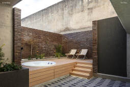 Por el contrario, las viviendas funcionan como contenedores introvertidos, que se cierran al sur y se abren hacia el norte. Para ello, las aberturas y los balcones se unifican en un gradiente de ranuras de distintas densidades que funcionan como filtro climático y resguardo de la intimidad, en una cuadra repleta de edificios al frente. En el fondo del lote la masa edilicia se organiza en torno a un patio que permite iluminar y ventilar los espacios del contrafrente del edificio hacia el norte y hacia al este.