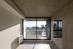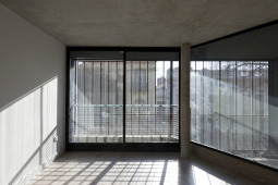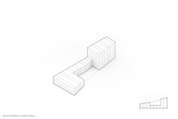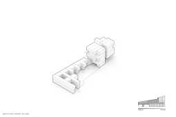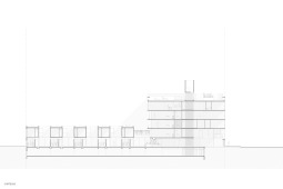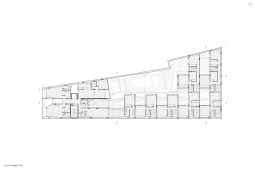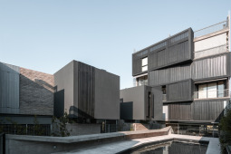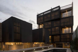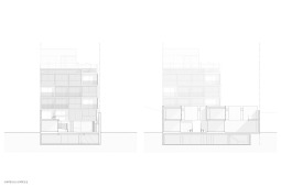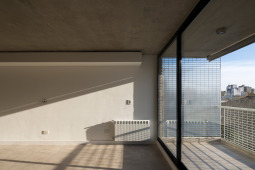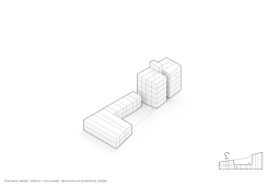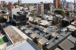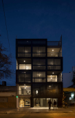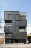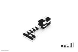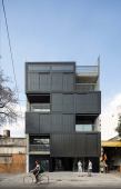 Como primera estrategia, una grilla ordenadora subdivide la masa edilicia, pensada como una modulación tanto habitacional como estructural. La misma se orienta hacia el Norte, tomando ventaja de la presencia del patio común. Naturalmente, las unidades del edificio se rotan, acomodándose hacia las orientaciones Este/Oeste, buscando iluminación y ventilación natural; y resolviendo los accesos desde el espacio público. A continuación, algunos módulos se receden para generar los espacios abiertos y semicubiertos: patios, galerías y balcones. La materialidad se divide cromáticamente en 2 grandes grupos, tomando el blanco y el negro, para acentuar el concepto de matriz modular. Se utiliza un sistema de parasoles móviles como control climático y para proveer la correcta intimidad hacia y desde los espacios comunes.