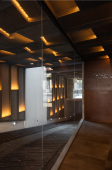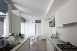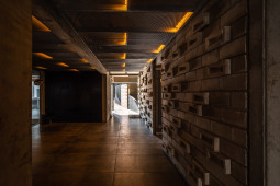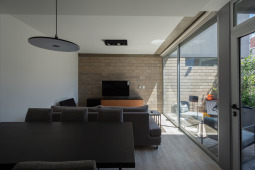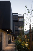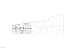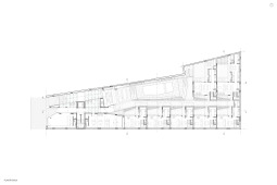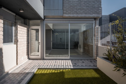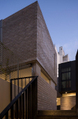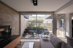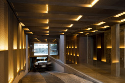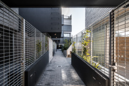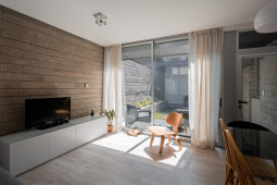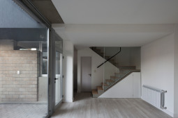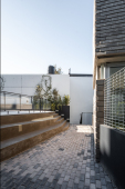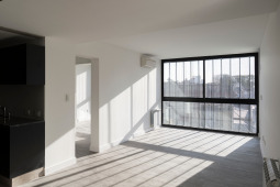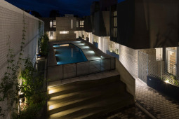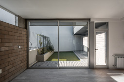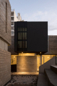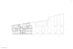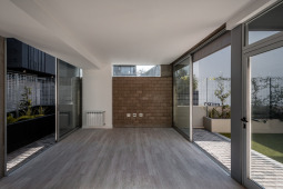 El contacto con el espacio público se resuelve a través de una serie de sutiles recesos, y un hall que funciona como una serie de espacios concatenados de distinto nivel de privacidad. Finalmente, la penetración de la vereda pública hacia al espacio común, articulada a través del uso de pavimento intertrabado, busca reforzar la conexión entre ambos espacios.