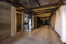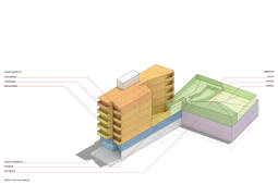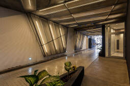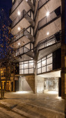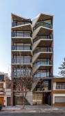 Como primera estrategia, el programa se fragmenta en 2 grandes conjuntos, ambos con accesos autónomos, en concordancia con la lógica geométrica del terreno. Dicha división permite una independencia proyectual a nivel funcional y estructural (evitando tediosas transferencias de cargas y/o subordinaciones programáticas a soluciones estructurales no compatibles). En el frente se ubica el comercio (en contacto directo con la calle), las oficinas, (en planta baja y primer piso) y los departamentos (de segundo a sexto piso). En el fondo, como respuesta a la creciente demanda de la zona, se ubican 45 cocheras (divididas en 3 niveles con iluminación y ventilación natural) y por encima de ellas, 315m2 de amenities, recuperando la condición inicial de pulmón de la manzana.