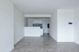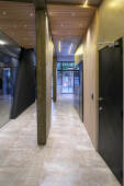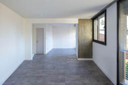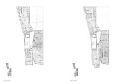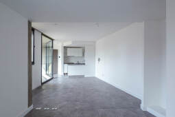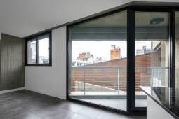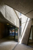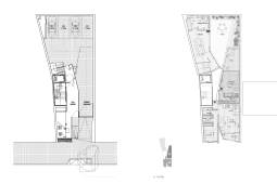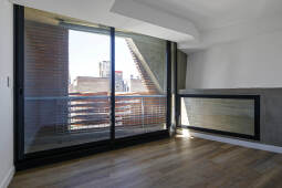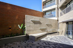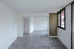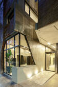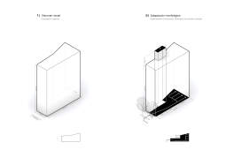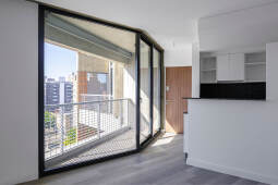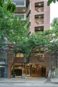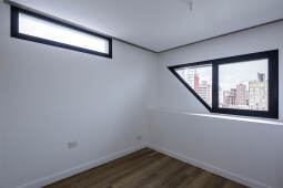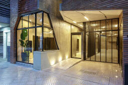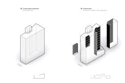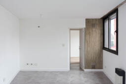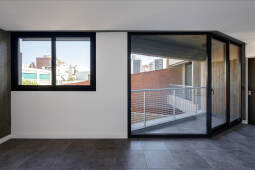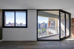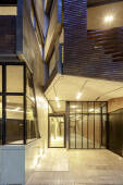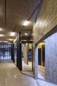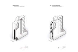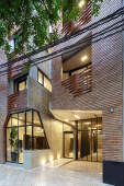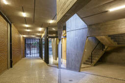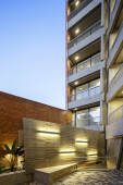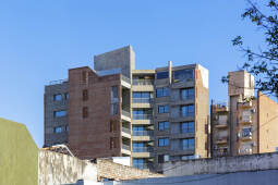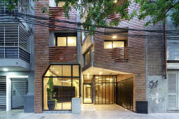 Como estrategia formal, el edificio se trabaja a partir de una envolvente de ladrillos que genera una continuidad superficial, la cual es horadada mediante dos patios que explotan la forma del lote (uno pequeño al frente y uno de mayor tamaño en el fondo) y las orientaciones/visuales anteriormente mencionadas. A continuación, se realizan 2 incisiones en el frente y contrafrente, sirviendo las mismas para otorgar mayor privacidad entre las unidades, como así también brindarles un mayor ingreso de luz natural. A su vez, los palieres se ven dotados de ventilación e iluminación natural. En el edificio conviven unidades pequeñas (loft) en los pisos inferiores con departamentos de uno y dos dormitorios, ubicados en los pisos superiores. Es este mix de tipologías el que le otorga la heterogeneidad formal al proyecto. Cuando la envolvente de ladrillos se ve interrumpida por las distintas operaciones proyectuales que responden a cada tipología, se exterioriza la estructura de hormigón armado, emergiendo como elemento expresivo del proyecto.