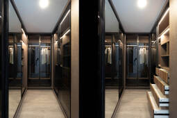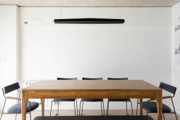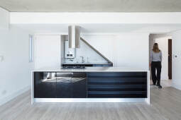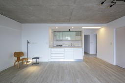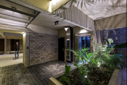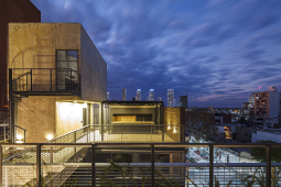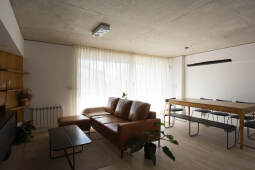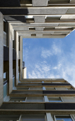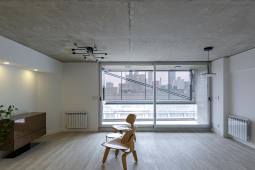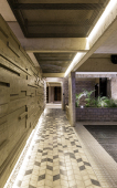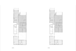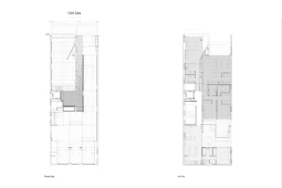 En el fondo del lote la masa edilicia se organiza en torno a un patio que permite proteger la orientación sur y orientar hacia el norte y hacia al este, obteniendo visuales sobre los lotes de edificaciones bajas, hacia calle Riccheri. El intertrabado estructural se propaga por las medianeras e invade el patio interno, utilizando al hormigón armado como material que define la expresividad del proyecto.